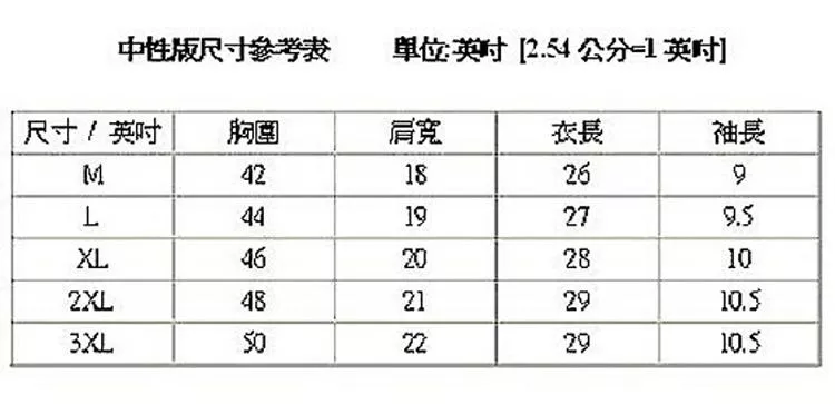 *商品規格 : M / L / XL / 2XL / 3XL (中性 男版)